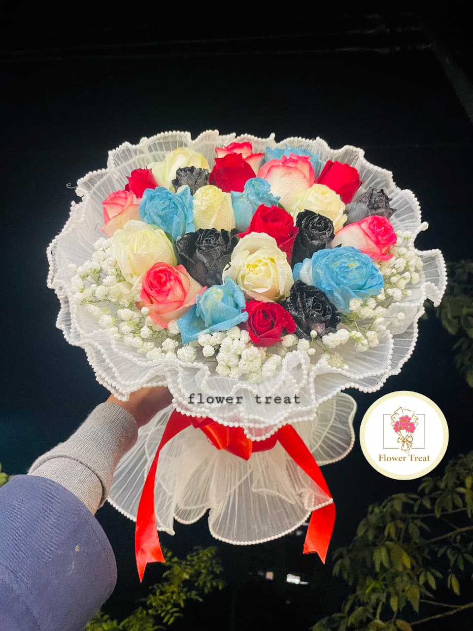 Celebrate love, joy, and beauty with our Mixed Color Rose Bouquet, featuring fresh, handpicked roses in a variety of vibrant colors, arranged beautifully with premium wrapping. This colorful bouquet symbolizes happiness, admiration, and affection, making it perfect for birthdays, anniversaries, weddings, or thoughtful gifting.