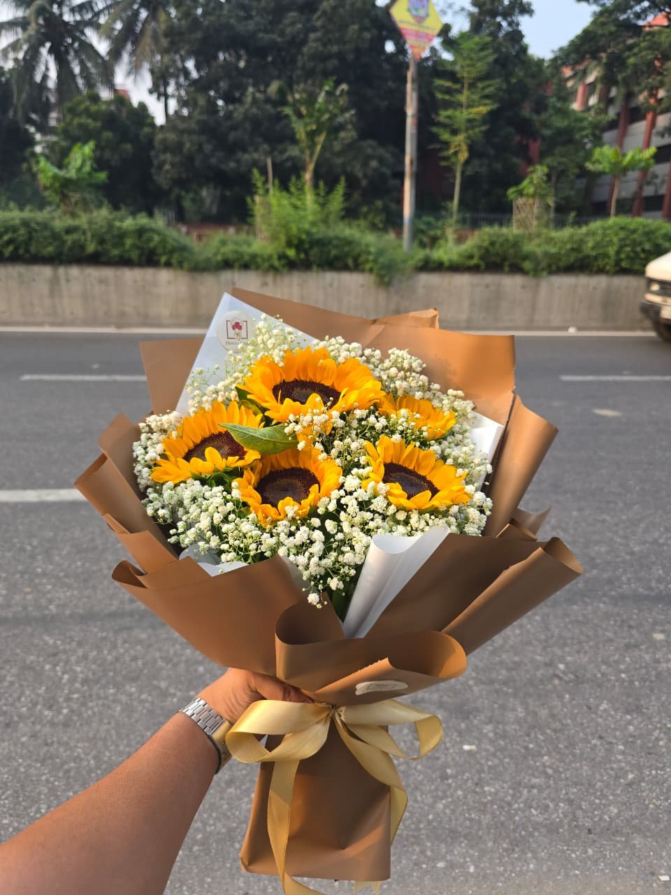 Fill any moment with warmth and happiness with our 5 Pcs Sunflower Bouquet. Each sunflower is handpicked for its vibrant color and freshness, then arranged beautifully with premium wrapping to create a cheerful, uplifting gift.